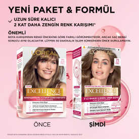 Excellence Creme ile boyama öncesine göre gözle görülür daha bakımlı saçlar! Excellence Creme beyazları %100 kapatırken daha sağlıklı görünen saçlar için saça nemi hapseder. Hyaluronik Asitle zenginleştirilen formülüyle 2 kat daha zengin renk karışımı* ve 10 kat daha fazla** nemlendirme sunar.