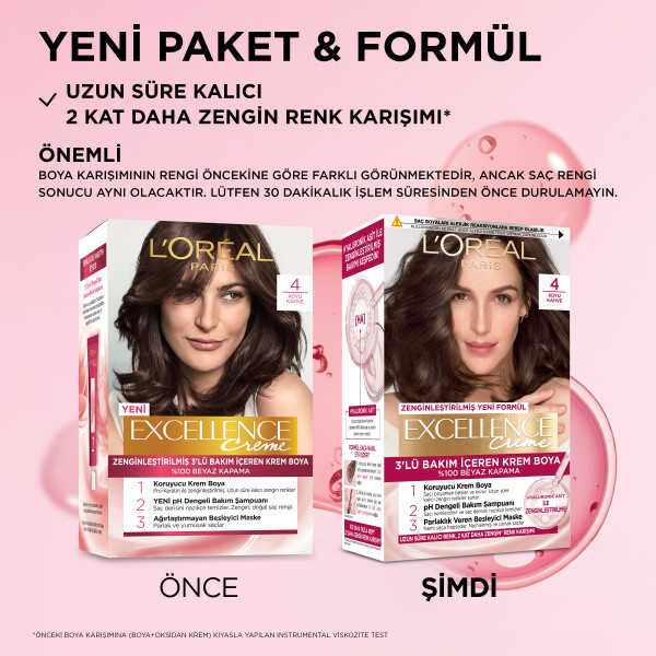 Excellence Creme ile boyama öncesine göre gözle görülür daha bakımlı saçlar! Excellence Creme beyazları %100 kapatırken daha sağlıklı görünen saçlar için saça nemi hapseder. Hyaluronik Asitle zenginleştirilen formülüyle 2 kat daha zengin renk karışımı* ve 10 kat daha fazla** nemlendirme sunar.