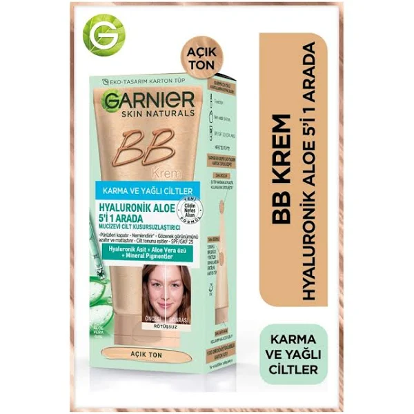 Garnier Bb Krem Hyaluronik Açık Ton 5 in 1 Garnier Hyaluronik Aloe Oil Free BB Krem Ürün Açıklaması Karma ve yağlı ciltler için kullanıma uygundur. Cilde nefes aldıran ve çıplak cilt etkisi veren yeni hafif dokulu bb krem Hyaluronik asit, Aloe Vera Özü ve Mineral Pigmentler içerir. Bu sayede nemlenmiş bir cilt hissi verir, cildinizde ferahlama ve eşit bir cilt tonu sağlar. Ürün Özellikleri Pürüzleri kapatır. Cilt nemli hissedilir. Gözenekler küçülmüş görünür. Cilt tonunu eşitler. Cildi matlaştırır. UV ışınlarına karşı koruma sağlar. SPF/GKF 25 koruma sağlar. Temiz cilde uygulayınız.