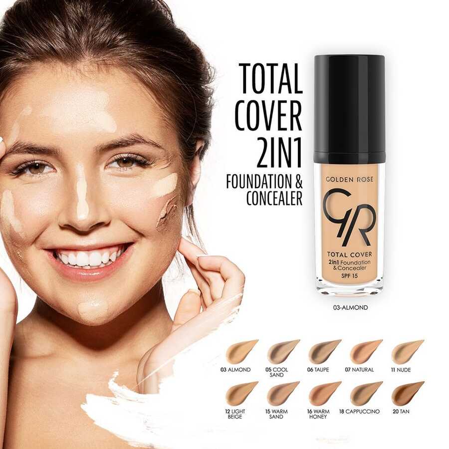 Fondöten ve Kapatıcı bir arada yepyeni formüle sahip olan Total Cover 2in1 Foundation & Concealer tüm yüze ve gözaltlarına uygulanır.Yüksek kapatıcı formülü, tüm cilt kusurlarını, lekeleri ve gözaltı morluklarını kapatmaya yardımcı olur.Yağ içermeyen yumuşak ve hafif yapısı ile kolayca sürülür yüzünüzde ağırlık hissi yaratmadan pürüzsüz ve doğal bir görünüm yaratır. İçeriğindeki Vitamin E ile cildinizi besler SPF 15 ile güneşin zararlı ışınlarından cildinizi korur, gün boyu kusursuz bir cilde sahip olmanızı sağlar.
