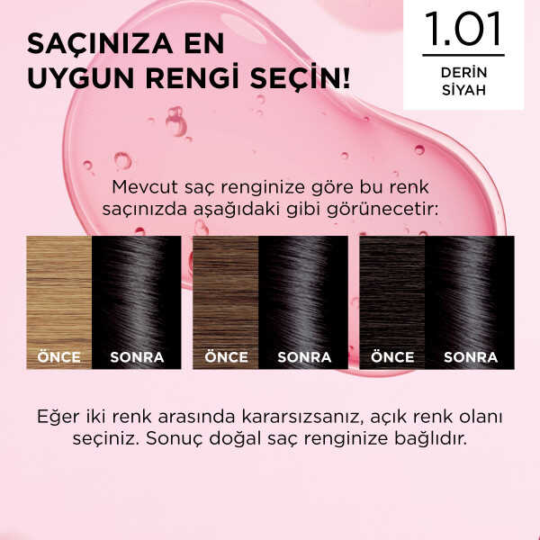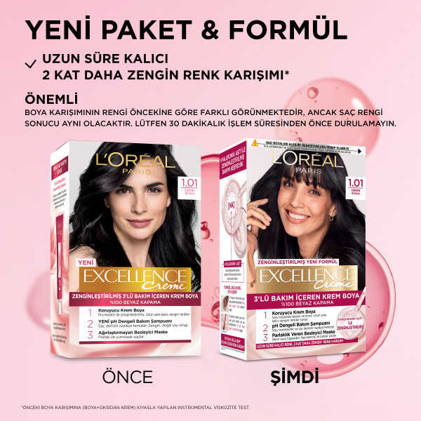 Excellence Creme ile boyama öncesine göre gözle görülür daha bakımlı saçlar! Excellence Creme beyazları %100 kapatırken daha sağlıklı görünen saçlar için saça nemi hapseder. Hyaluronik Asitle zenginleştirilen formülüyle 2 kat daha zengin renk karışımı* ve 10 kat daha fazla** nemlendirme sunar.