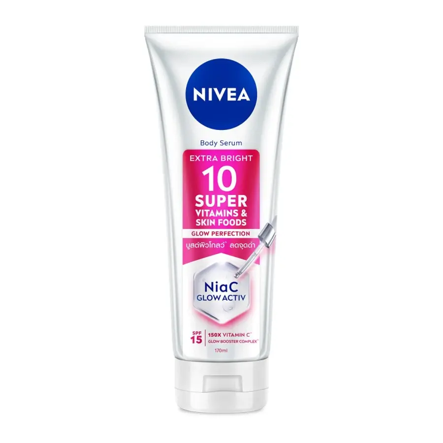 NIVEA Extra Bright 10 Süper Vitamin ve Cilt Besinleri Vücut Serumu, güçlü bir Niacinamid ve C Vitamini karışımı içeren NiaC Glow Activ ile formüle edilmiştir. Bu çift aktif bileşen, cilt katmanlarına derinlemesine nüfuz ederek mükemmel bir cilt için 5D ışıltı sağlar.