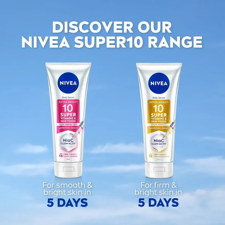 NIVEA Extra Bright 10 Süper Vitamin ve Cilt Besinleri Vücut Serumu, güçlü bir Niacinamid ve C Vitamini karışımı içeren NiaC Glow Activ ile formüle edilmiştir. Bu çift aktif bileşen, cilt katmanlarına derinlemesine nüfuz ederek mükemmel bir cilt için 5D ışıltı sağlar.