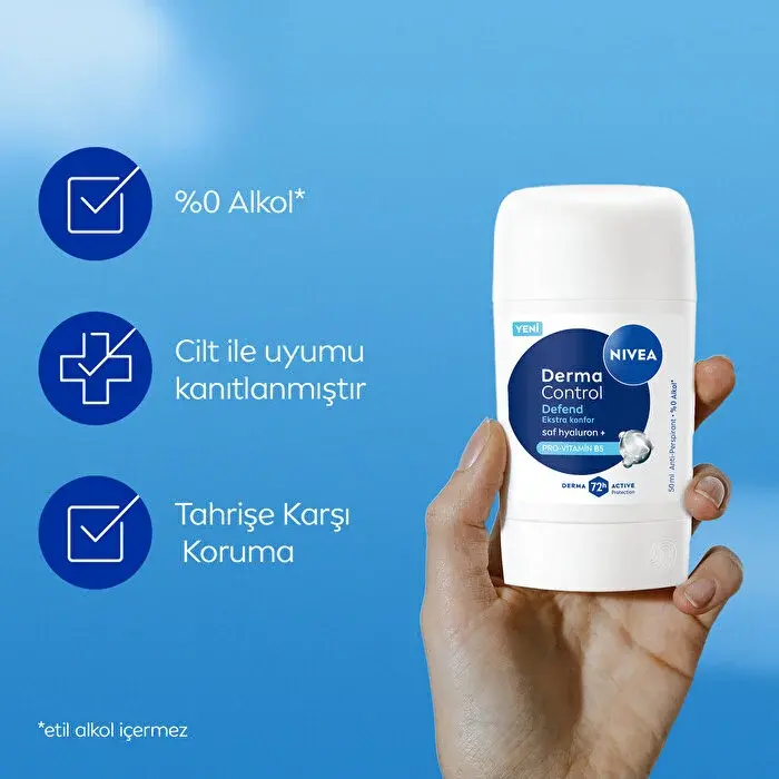 NIVEA Kadın Stick Deodorant Derma Control Defend 50ml Saf Hyaluron ve Pro-Vitamin B5 ile geliştirilmiş formülü tüy alımı sonrası oluşan tahrişe karşı cildi korur.